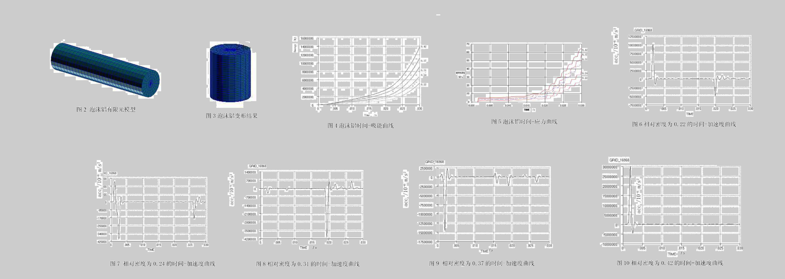 泡沫鋁模型如圖2所示,長為340mm,直徑為80mm。泡沫鋁材料的本構(gòu)關(guān)系采用MSC.dytran 中的FOAM1模型,應(yīng)力-應(yīng)變關(guān)系曲線則采用文獻(xiàn)中所提供的曲線,將此曲線等效為材料場的形式來模 擬泡沫鋁材料。本文分別對(duì)相對(duì)密度為0.22,0.24,0.31,0.37,0.42五種不同密度的泡沫鋁進(jìn)行了仿真。仿真采用主從接觸搜索方法,定義質(zhì)量為1Ton的剛體,以速度30km/h 軸向撞擊泡沫鋁。仿真時(shí)間為0.03s。時(shí)間步長為5e-8s。